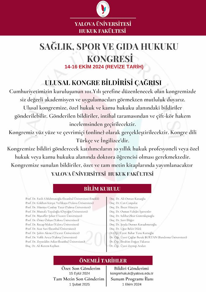 Fakültemiz bünyesinde Sağlık, Spor ve Gıda Hukuku Kongresi geçekleştirilecektir. Cumhuriyetimizin kuruluşunun 101.Yılı şerefine düzenlenecek olan kongremizde siz değerli akademisyen ve uygulamacıları görmekten mutluluk duyarız. Ayrıntılı bilgiler ekteki afişte yer almaktadır.