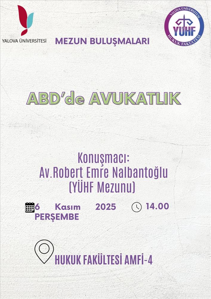 6 Kasım 2025 tarihinde Av. Robert Emre NALBANTOĞLU'nun katılımıyla ABD'de Avukatlık konulu etkinlik gerçekleştirilecektir.