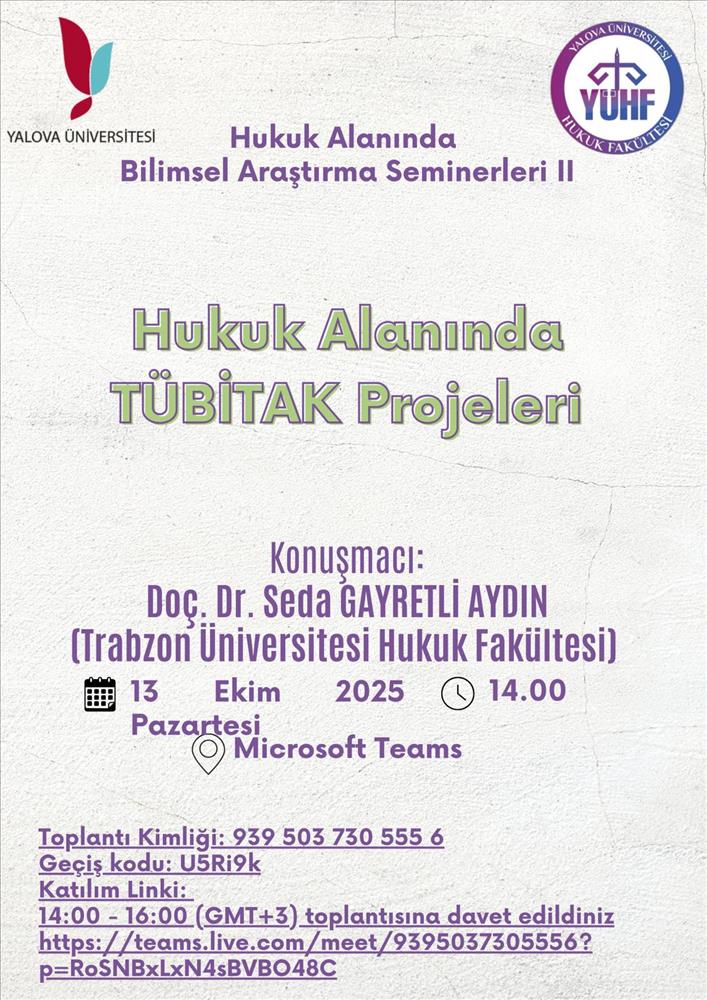 Hukuk Alanında Bilimsel Araştırma Seminerleri kapsamında Trabzon Üniversitesi Hukuk Fakültesi’nden Doç. Dr. Seda Gayretli Aydın'ın katılımıyla hukuk alanında TÜBİTAK projelerine başvuru ve projelerin yürütülmesi ile ilgili online bilgilendirme toplantısı yapılacaktır.
