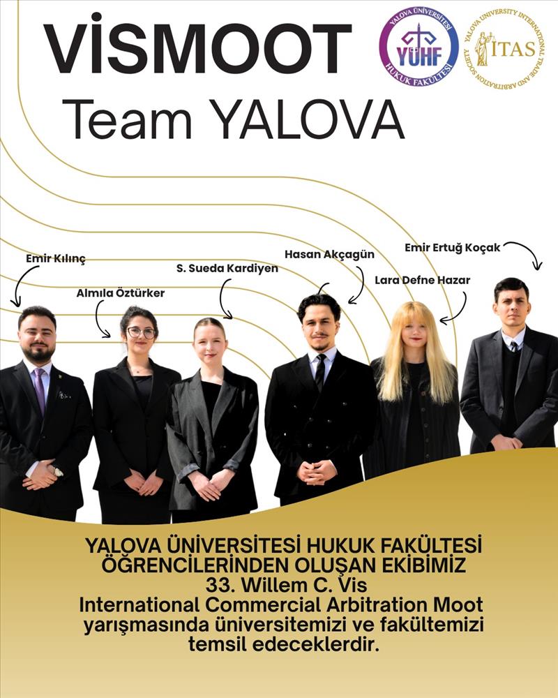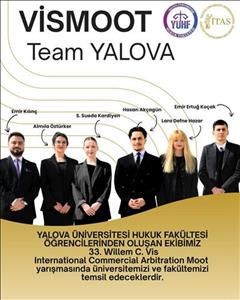 Yalova Üniversitesi Hukuk Fakültesi, bu sene düzenlenen 33. Willem C. Vis Uluslararası Ticari Tahkim Yarışması’na bir takımla katılım sağlamıştır. Yarışmada Fakültemizi Emir Ertuğ Koçak, Semra Sueda Kardiyen, Hasan Akçagün, Emir Kılınç, Almıla Öztürker ve Lara Defne Hazar’dan oluşan takım temsil etmektedir.